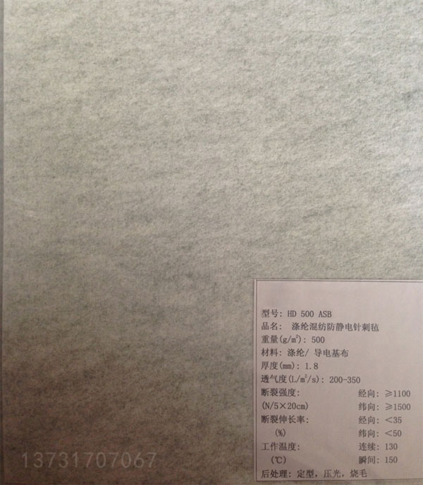 生產流程:纖維開松 --- 梳理 --- 疊網 --- 予針刺 --- 主針刺 --- 軋光 --- 浸漬拒水防油工作液 --- 焙烘 --- 熱定型 --- 成品